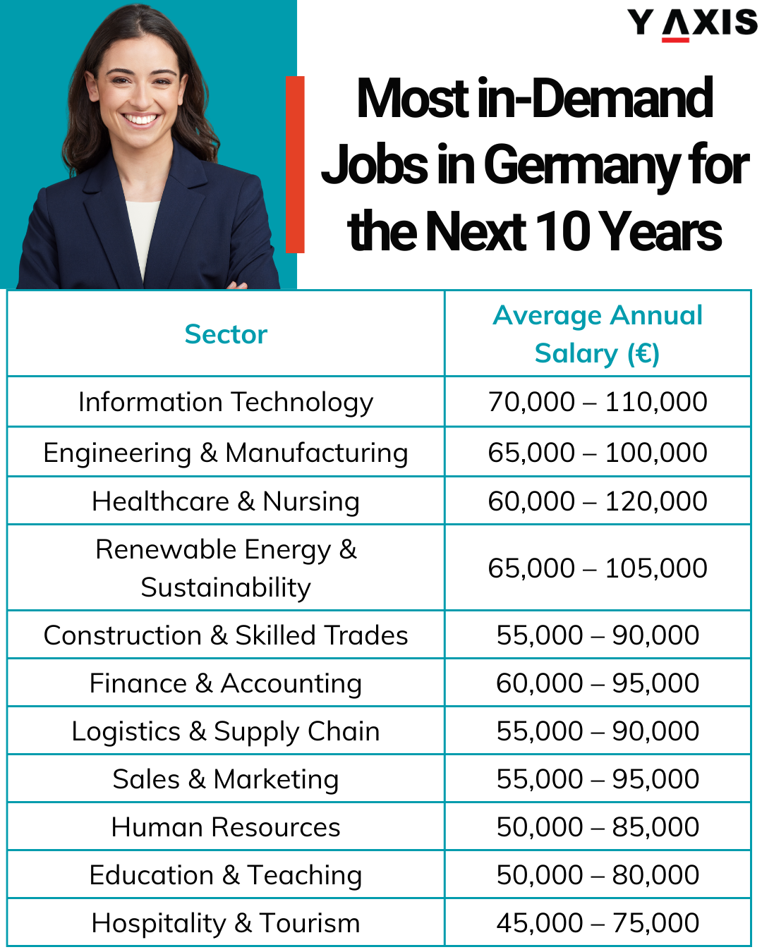 The highest job demand in Germany over the next decade will be in information technology, engineering and manufacturing, healthcare and nursing, renewable energy, construction and skilled trades, logistics and supply chain, and finance. These sectors are supported by government investment, industrial modernisation, and workforce shortages, ensuring strong hiring, competitive salaries, and long-term career growth for skilled professionals.