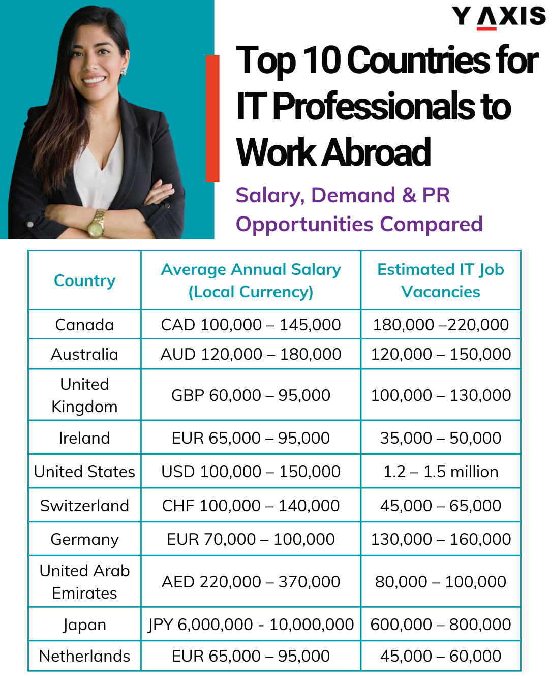 The best countries for IT professionals to work abroad include Canada, Australia, the United States, the United Kingdom, Germany, Ireland, the UAE, the Netherlands, Switzerland, and Japan. These destinations offer strong demand for IT jobs abroad, competitive salaries, employer-sponsored work visas, and long-term PR or residence options. Demand is high for software developers, cloud engineers, AI specialists, data engineers, and cybersecurity professionals due to ongoing digital transformation and technology investments.